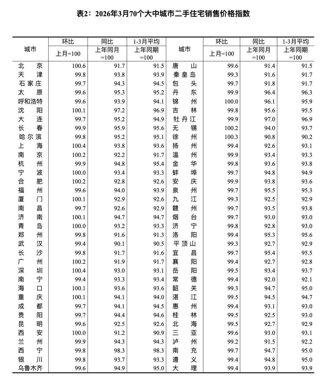4月16日,国家统计局网站发布2026年3月份70个大中城市商品住宅销售价格变动情况。整体来看,70个大中城市中,一线城市商品住宅销售价格环比上涨,二三线城市环比降幅收窄或相同。新建商品住宅和二手住宅销售价格环比上涨城市个数均比上月增加。