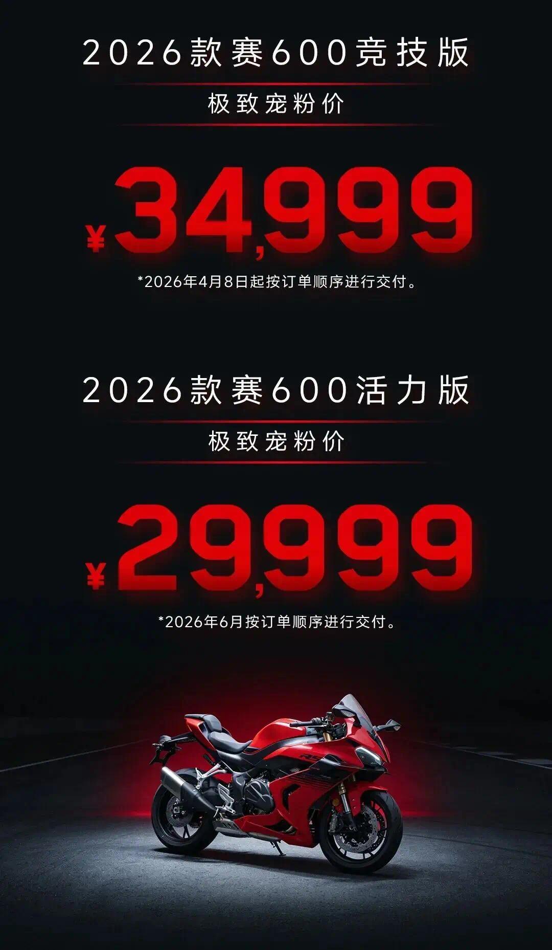 QJMOTOR官宣了2026款赛 600!,据悉,此款车型是QJMOTOR基于赛 800 平台打造的中排量四缸仿赛旗舰,搭载680cc 直列四缸、百匹马力、电子油门、真弯道ABS、马祖奇全可调悬挂、Brembo 制动、TCS、电子快排!